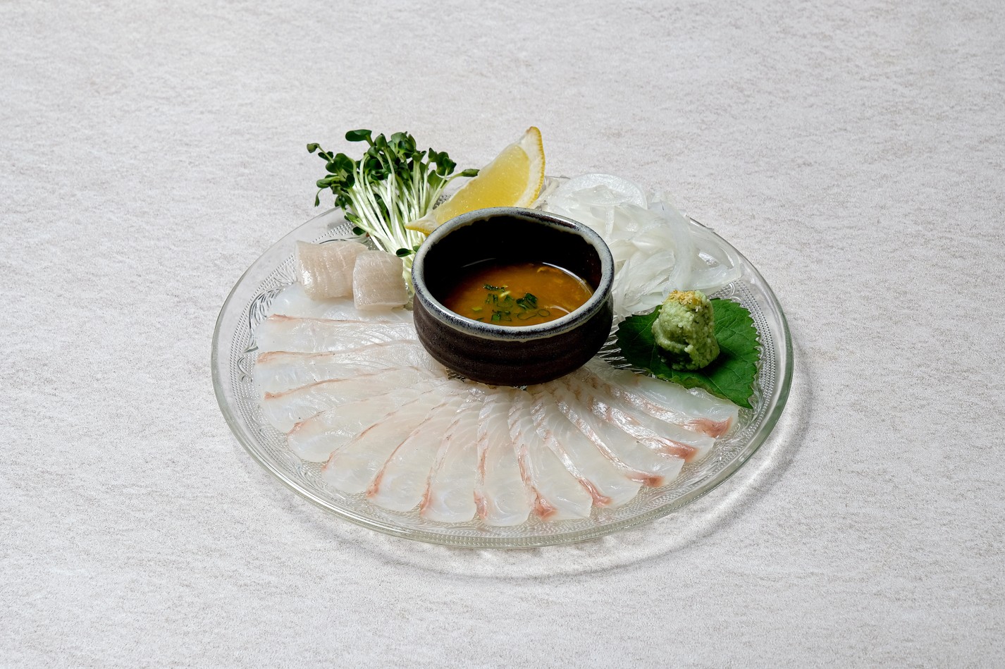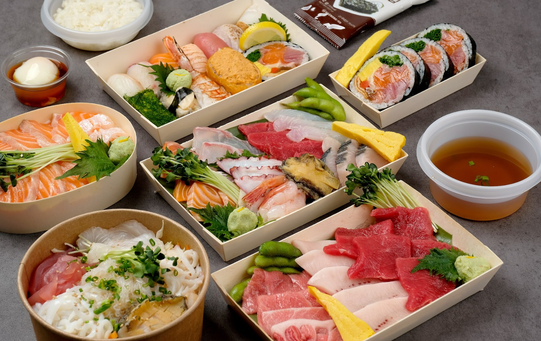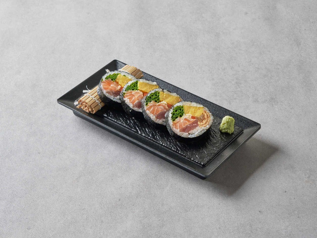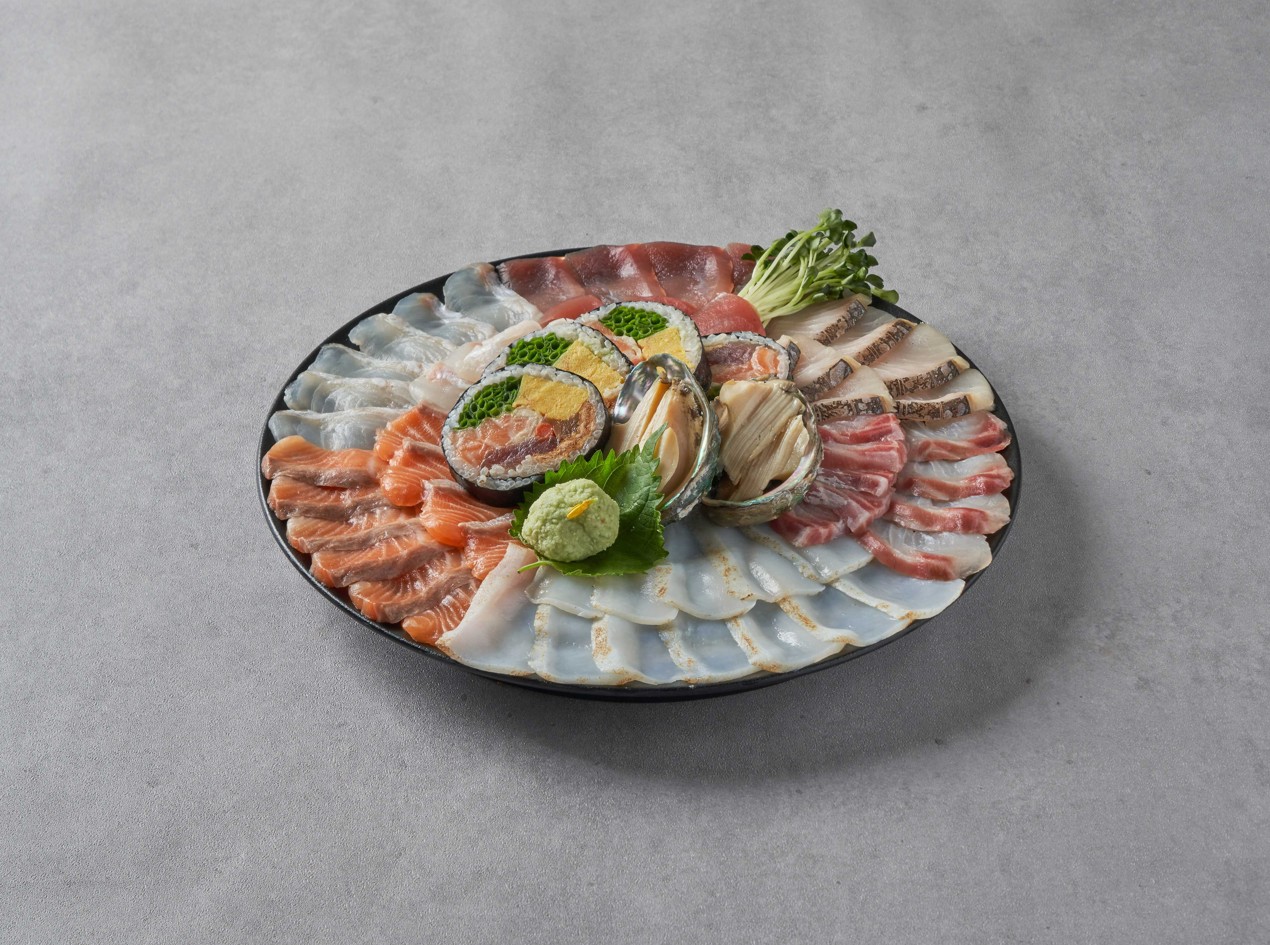 참돔,광어, 연어,대포이까, 참치, 제철생선, 찐전복, 후토마끼로 구성된 모듬사시미
